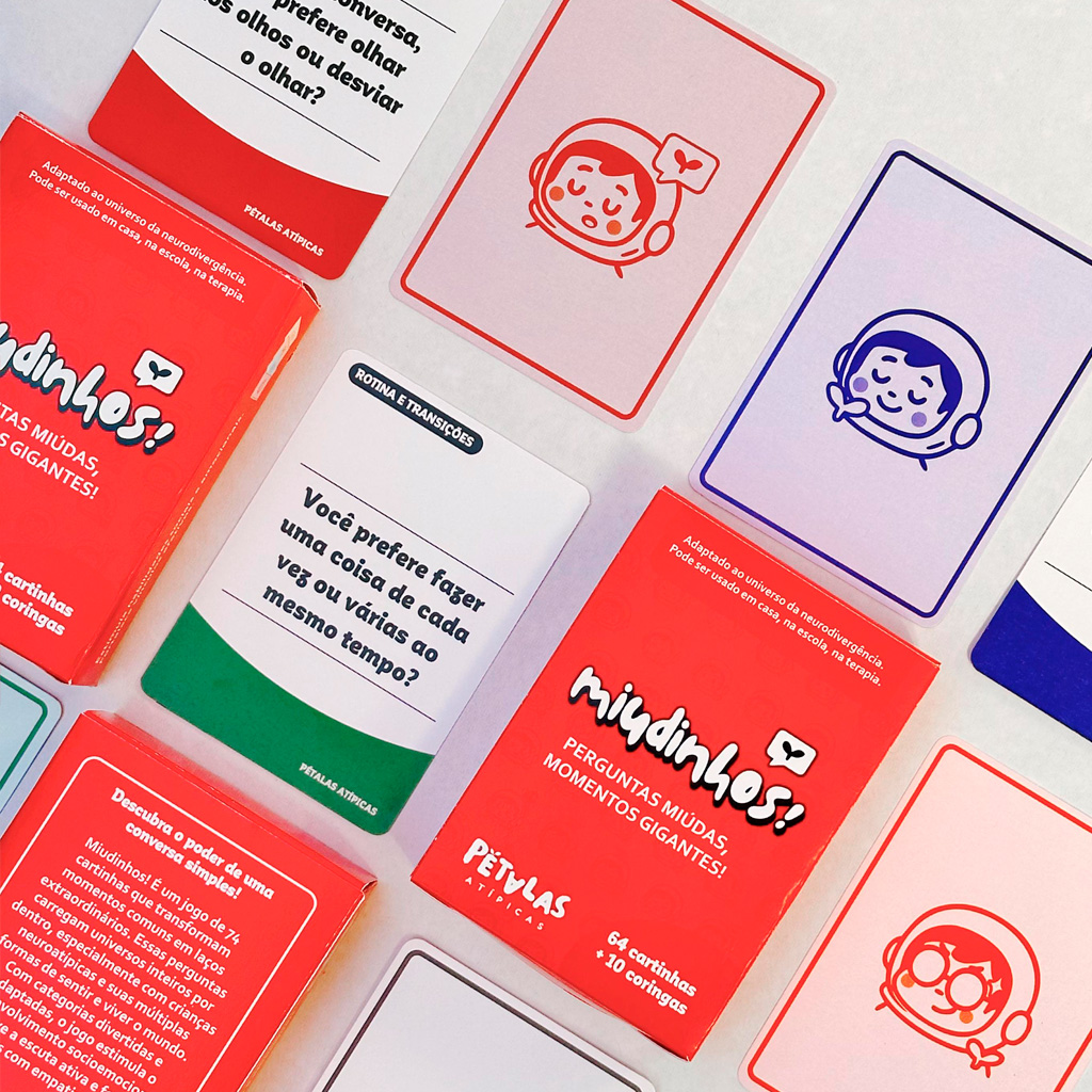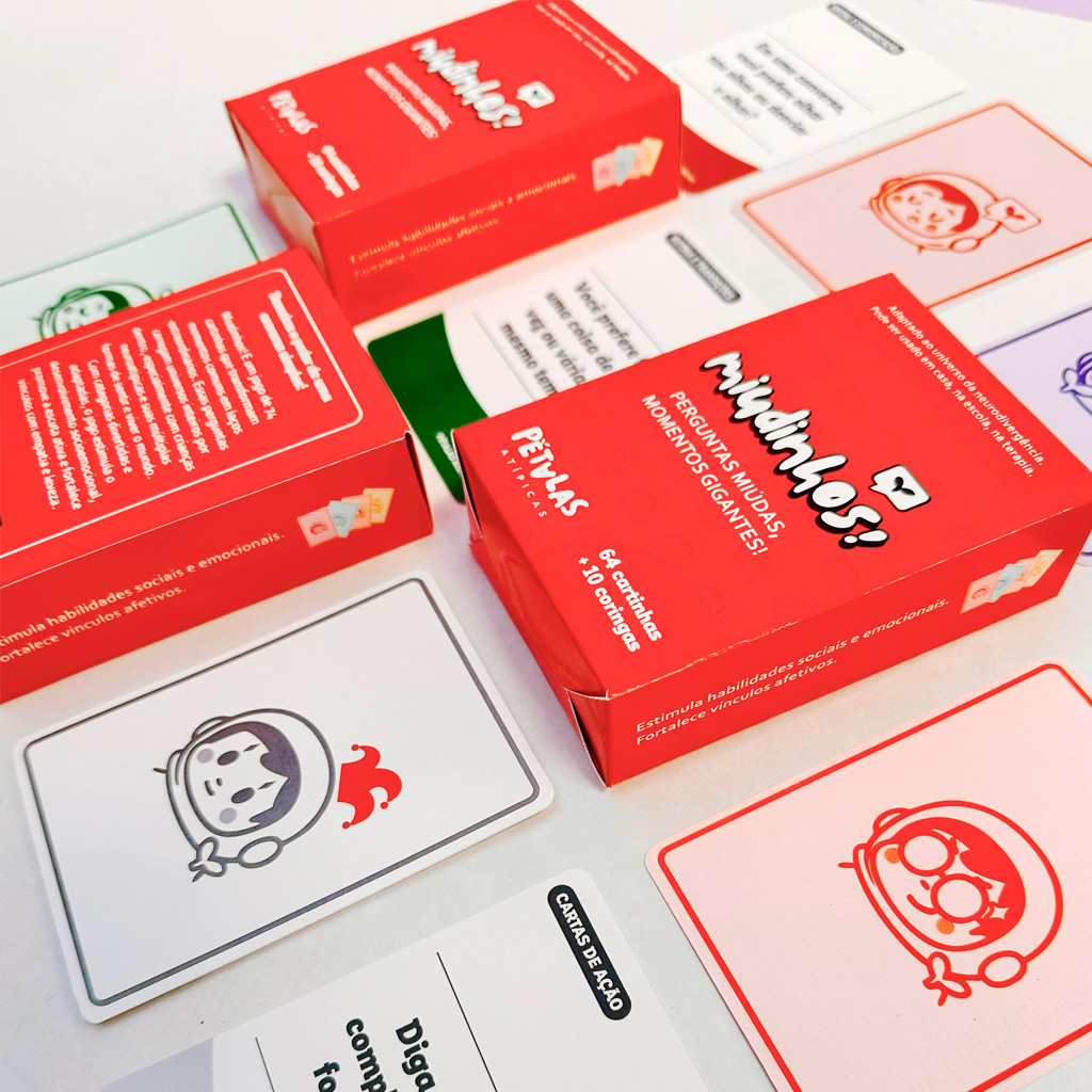 O Miudinhos! é um jogo de cartas em formato de baralho terapêutico, desenvolvido para estimular as habilidades socioemocionais de crianças e jovens de forma divertida, criativa e afetiva.